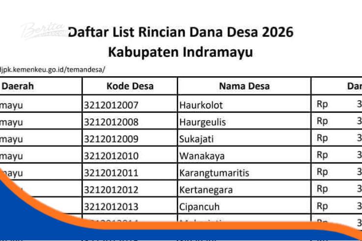 INDRAMAYU – Informasi mengenai besaran Dana Desa (DD) tahun anggaran 2026 ramai beredar di media sosial. Dalam unggahan tersebut, tercantum daftar rincian Dana Desa untuk sejumlah desa di Kabupaten Indramayu, dengan nominal sekitar Rp373 juta per desa.