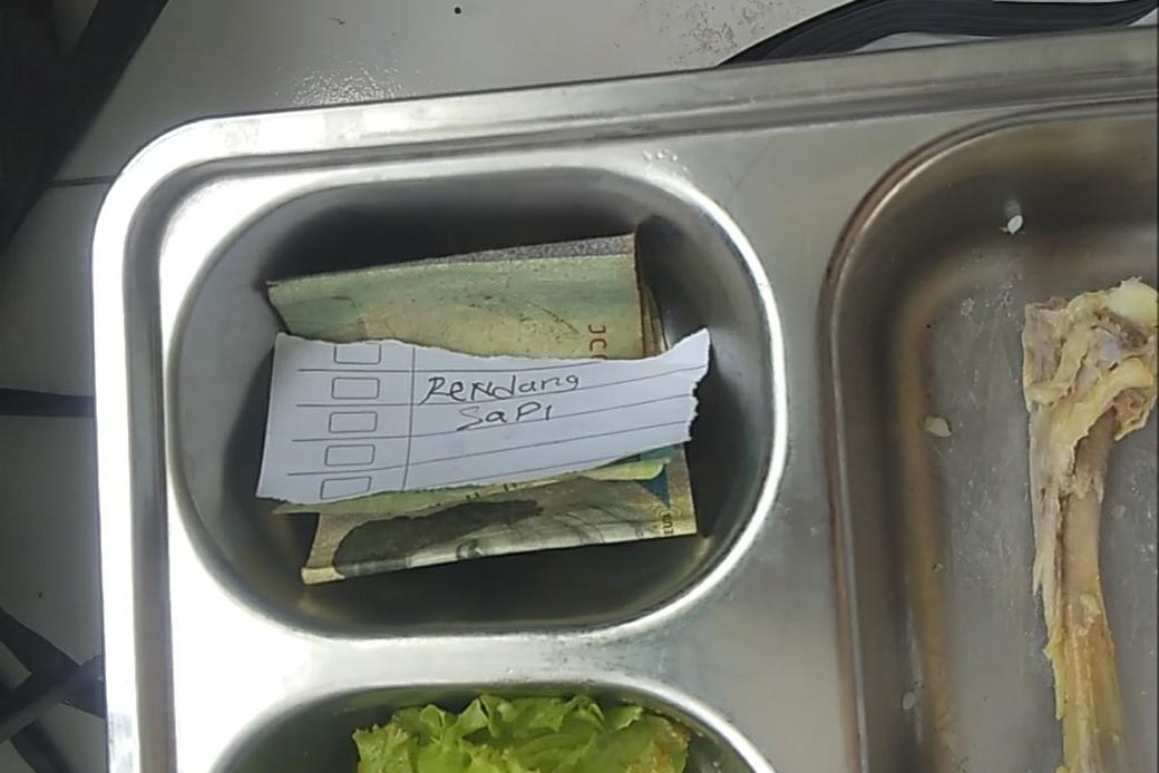INDRAMAYU — Aksi tak biasa terjadi di lingkungan SMK Taruna Indramayu. Seorang siswa menyelipkan uang Rp2.000 ke dalam ompreng program Makan Bergizi Gratis (MBG), lengkap dengan secarik kertas bertuliskan “Rendang Sapi”.